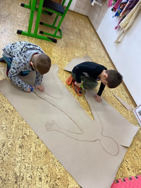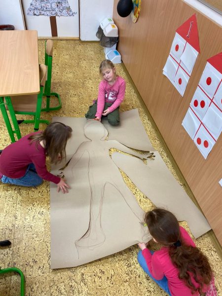Potom už následovala praktická část, kdy žáci ve skupinkách vzájemně obkreslili jednoho spolužáka na velký arch papíru a popsali jednotlivé části lidského těla i základní vnitřní orgány.
