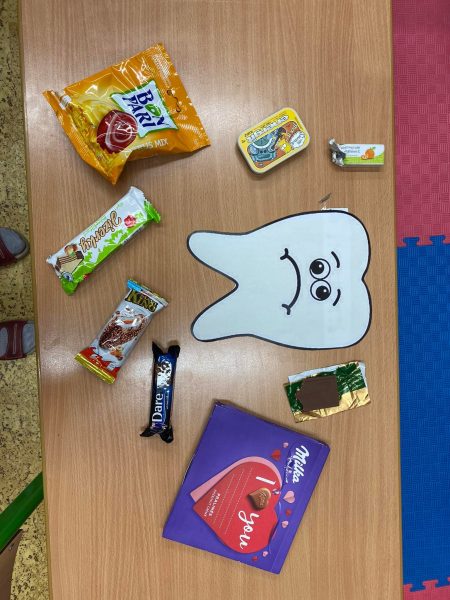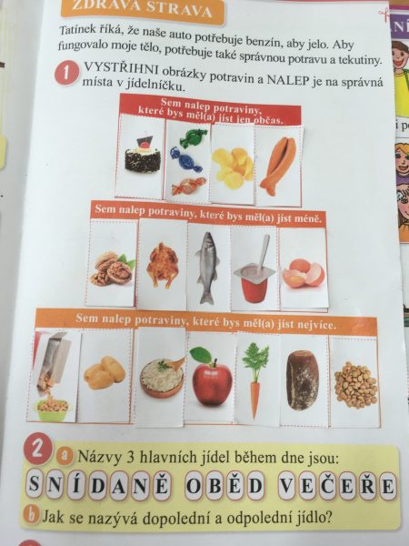 Další část projektového dne pokračoval ve znamení zdravé výživy, kdy žáci formou brainstormingu vymýšleli slova, která souvisí se zdravou výživou. Společně plnili úkoly na pracovních listech, proběhla i společná svačina složená ze zdravých potravin. . Potraviny byly vybrány s ohledem na zdravý vývoj a růst zubů. Potraviny žáci zkoumali i pomocí smyslů, tedy hmatem, čichem i chutí. Nakonec vytvořili plakáty a pracovní listy s pyramidou zdravé výživy a také lidskou postavu s rozdíly zdravé a nezdravé výživy.