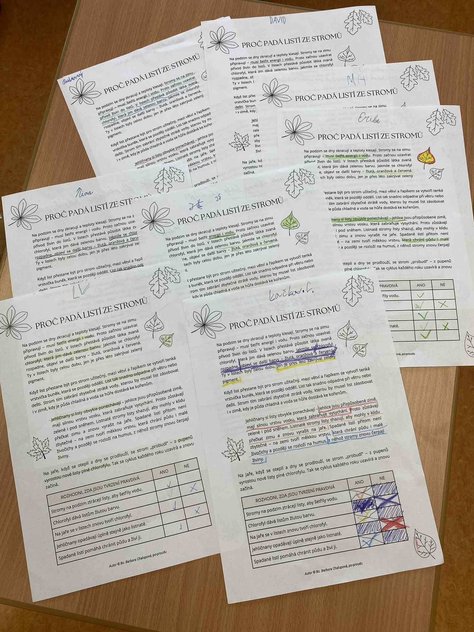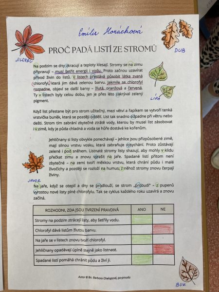 V rámci přírodopisu a prvouky se učili rozpoznávat druhy stromů, ve výtvarné výchově tvořili krásné obrázky inspirované podzimní přírodou a v českém jazyce psali básničky a krátké příběhy o stromech. Nedílnou součástí byli i běhačky a pátračky v přírodě, některé v rámci spolupráce mezi žáky 1. a 2. stupně, kdy starší žáci byli organizátory a průvodci aktivit.