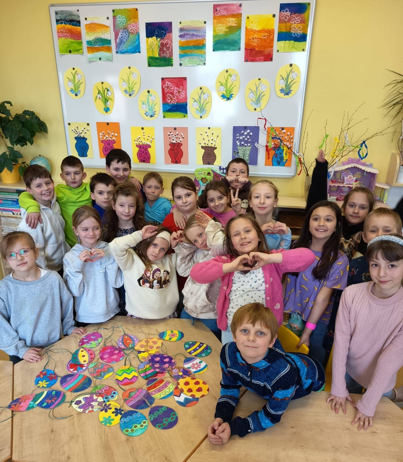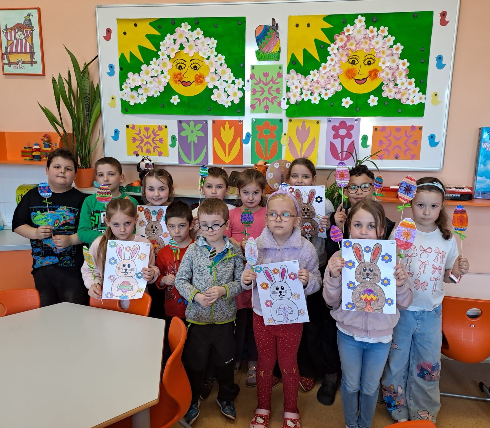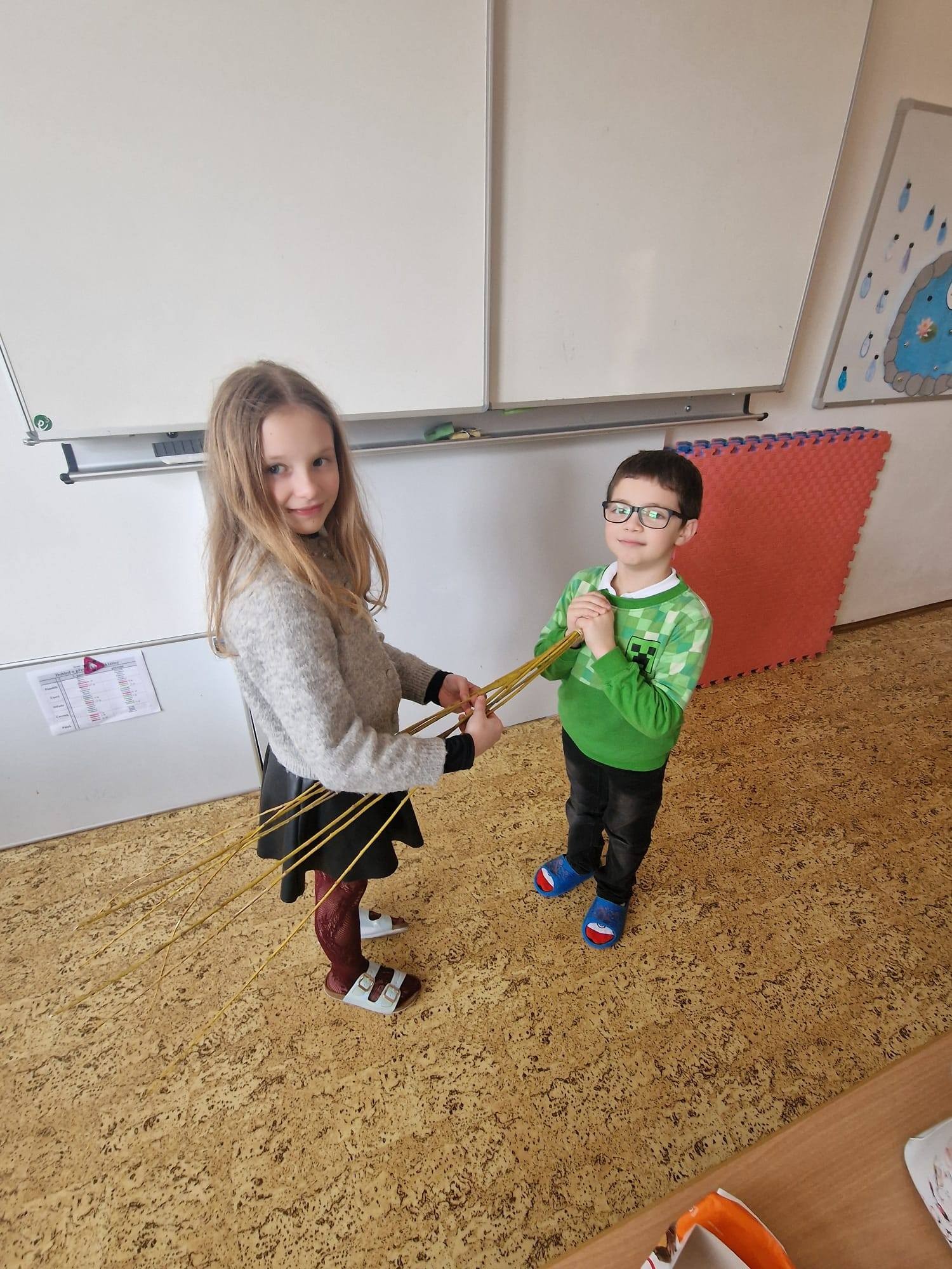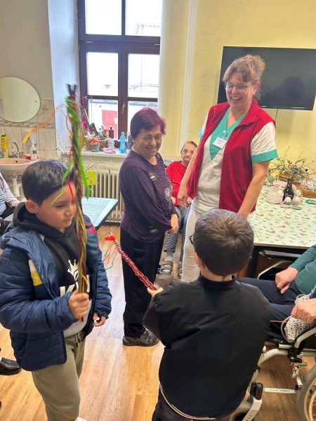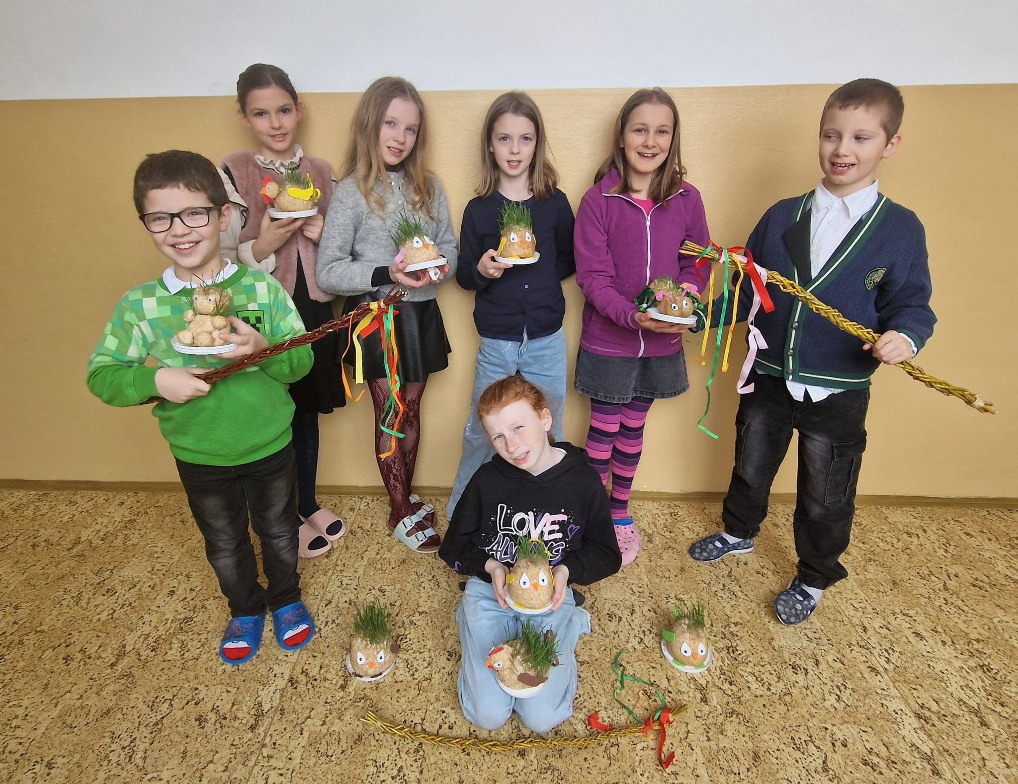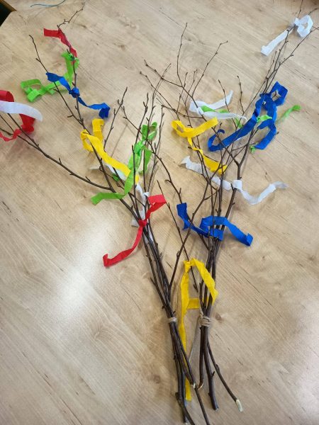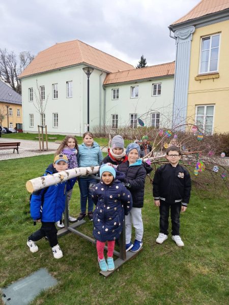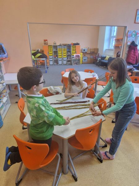 Vyráběly jsme krásná, barevná, papírová vajíčka, kterými jsme společně zdobili velikonoční stromy na náměstí. Domů si děti tvořily velikonoční zápichy a ve III. oddělení vytvářely travňáky a pletly pomlázky. Pomlázky děti v Domově využily a symbolicky vymrskaly babičky.