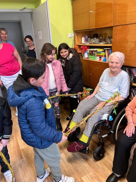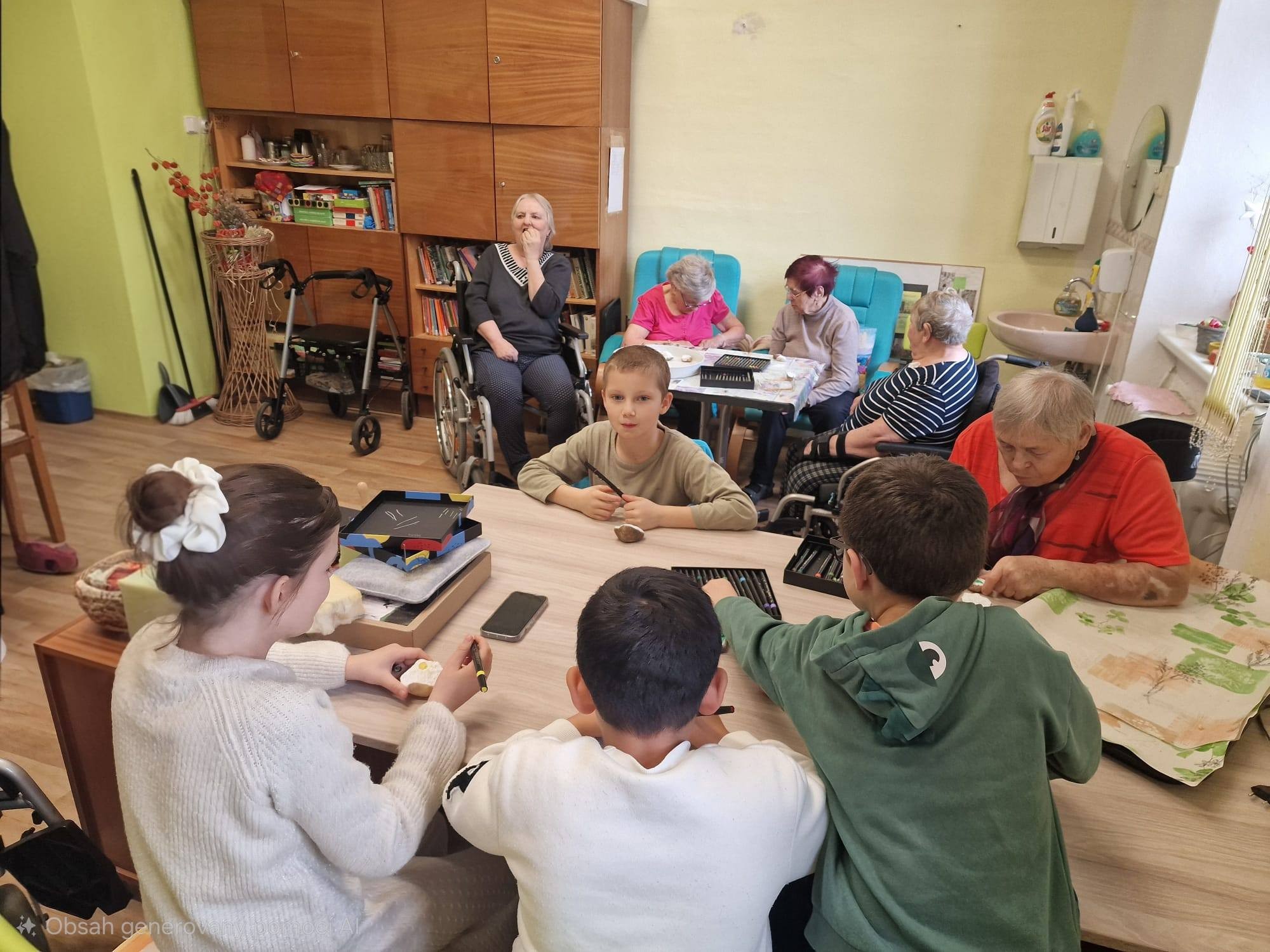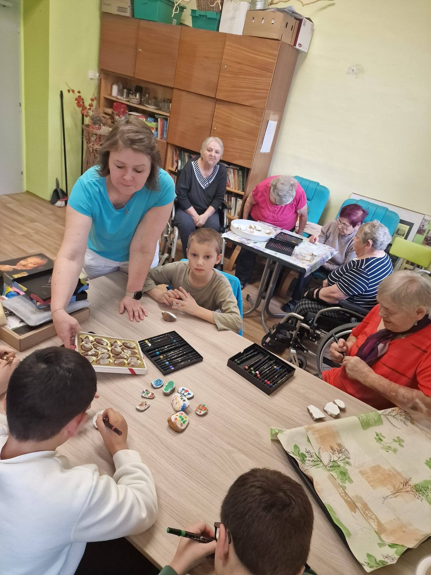 Hned následující den po vynášení Moreny proběhla další krásná spolupráce s Domovem pro seniory, která se uskutečnila přímo v dílničce Domova. Děti společně s klienty malovaly a zdobily kamínky.