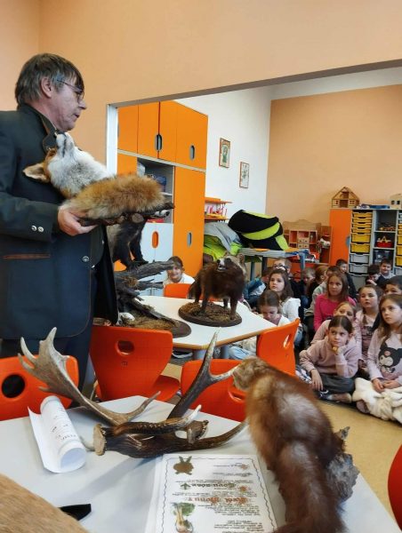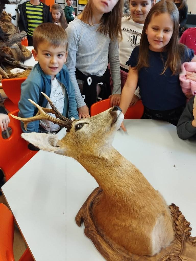 Následovala beseda s panem Surovíkem o myslivosti. Dozvěděli jsme se mnoho zajímavostí o péči o lesní zvěř, zejména o tom, jak jí myslivci pomáhají během zimních měsíců. Velkým zážitkem byly také ukázky trofejí, které si děti mohly zblízka prohlédnout.