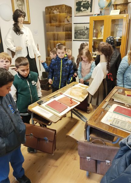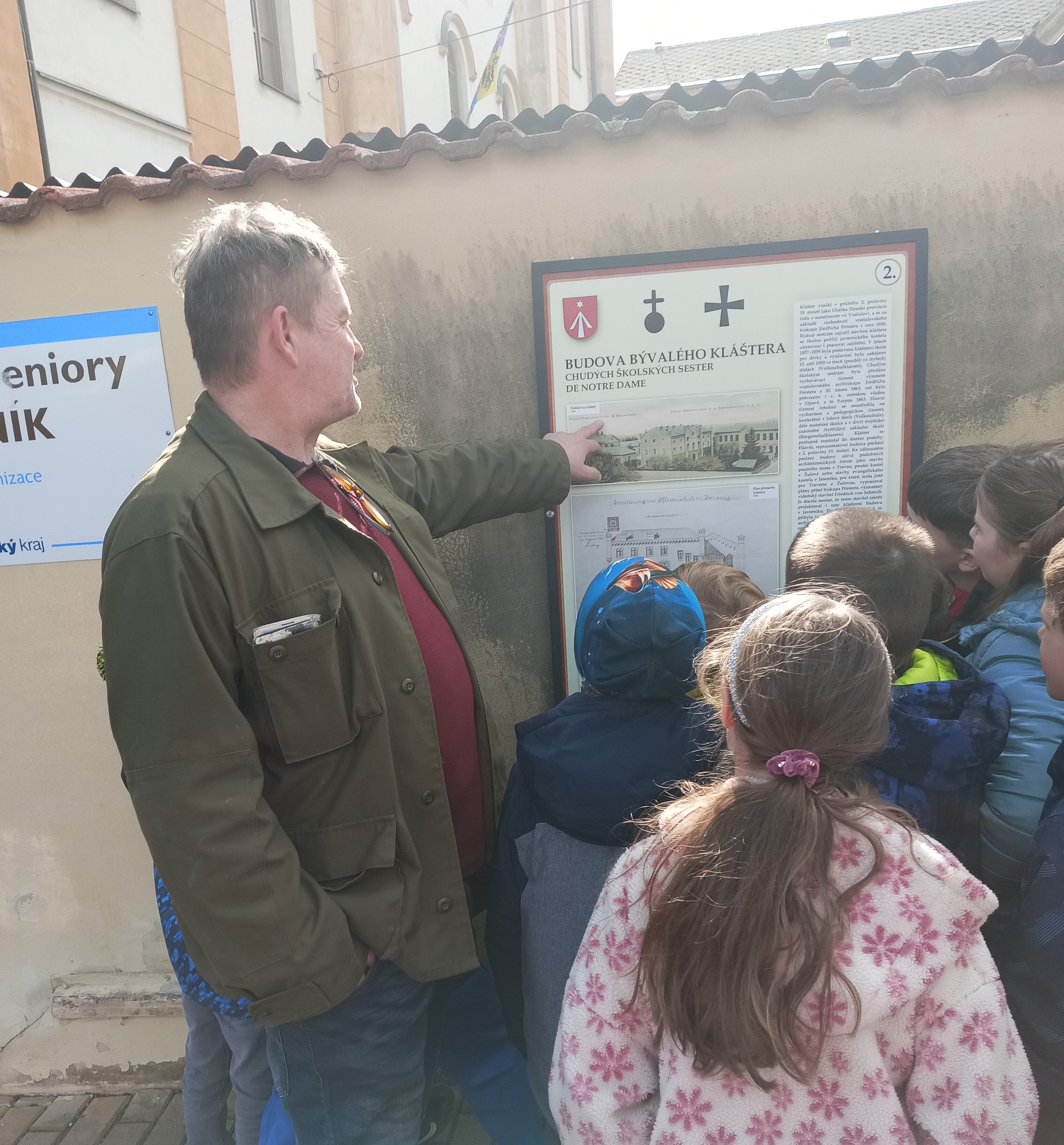 Závěr naší exkurze patřil škole, kde nad jejími kresbami z 18. až 20. století pan Rychlý seznámil děti s historickými událostmi, které se odehrály v budovách školy a dnešního Domova pro seniory.