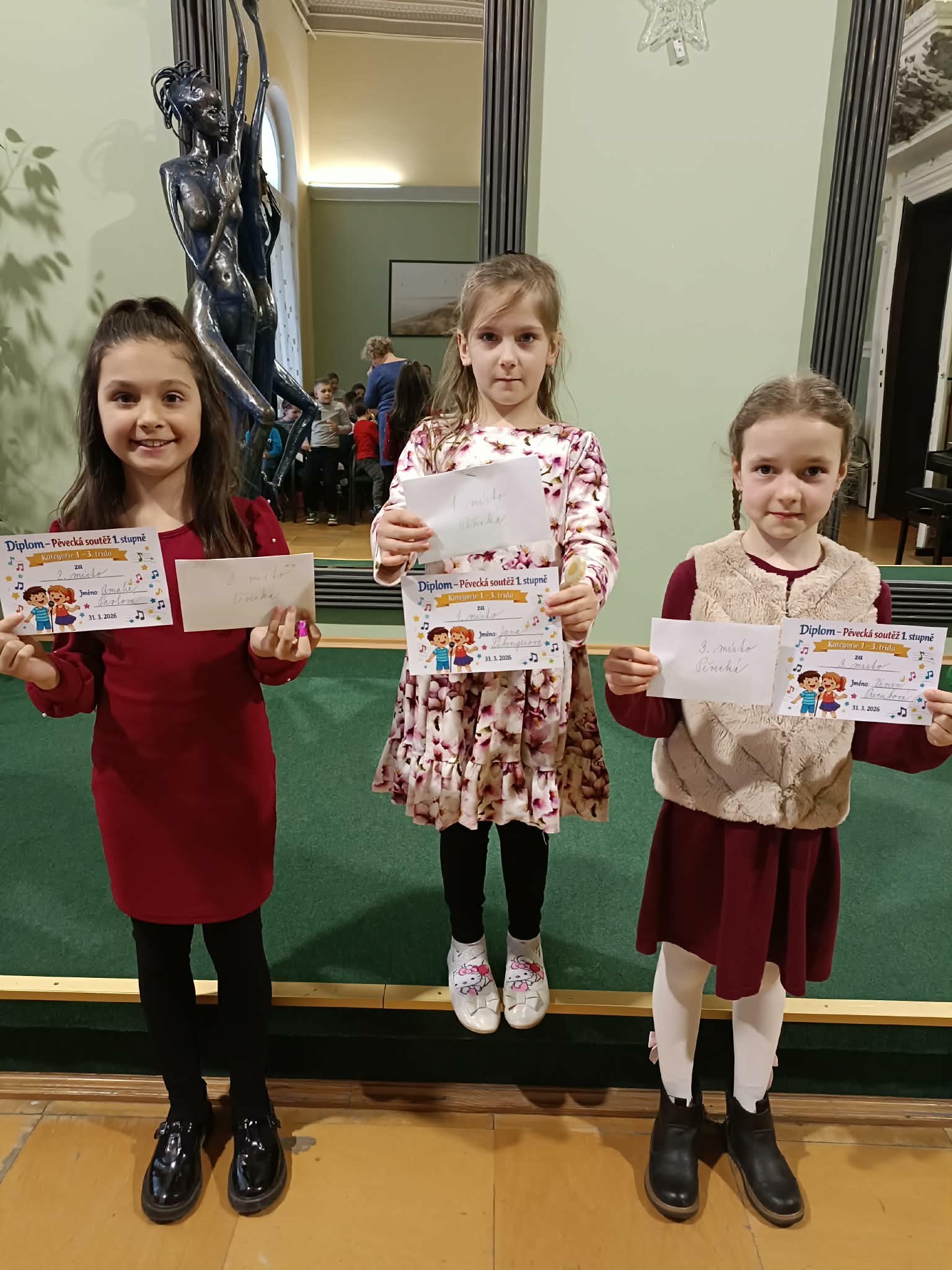 Dne 31.3. se konala pěvecká soutěž 1. stupně - školní kolo. V kategorii 1.- 3. tříd si 3. místo vyzpívala Vivien Precubová /2. A/, 2. místo Amálie Pavlová / 2. B/ a místo nejvyšší si vyzpívala Jana Fibingerová také /2. A/ . V kategorii 4.-5. tříd si Kristýna Gažová umístila na 3. místě, na 2. místě Magdaléna Gažová obě / 5. B /a 1. místo bylo uděleno Emílii Horáčkové / 4. B/. Soutěž se opět konala v krásném prostředí zrcadlového sálu KD.